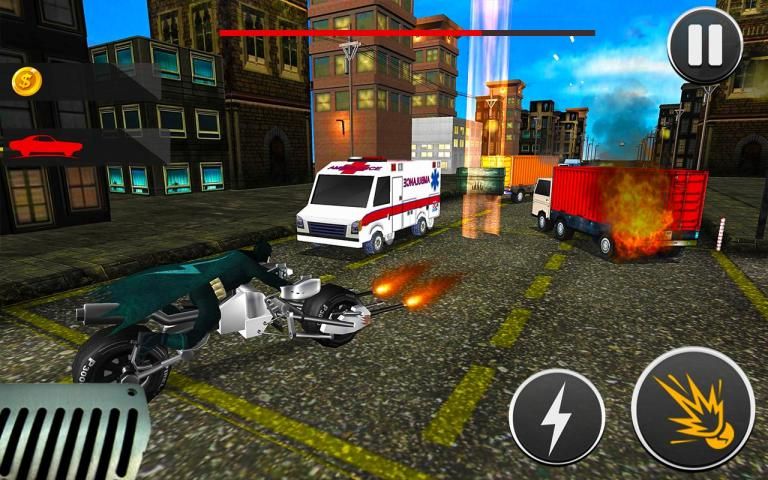 In this BAT BIKE STUNT RIDING SIMULATOR 2019 game you will drive your heavy bike with furious speed on city traffic highway and destroyed the different racing car, taxi, ambulance, police car, chopper and police motorbike with a machine gun and guided missiles.