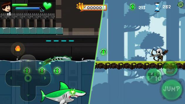 To complete the platformer ben games Super ben's 10(ten) will jump and run up to speed on many obstacles, fight and shoot against fire fly ninjas, the bats, reboot, ten, Heatblast, humungousaur, tennyson, skeletons, toys, kevin 11, Sharks, force omnitrix and Omniverse many other ben force ultimate transform super alien monsters