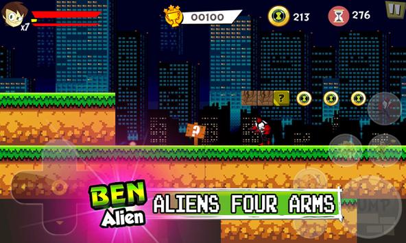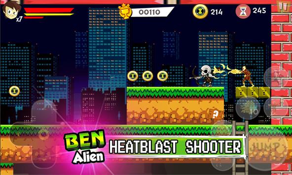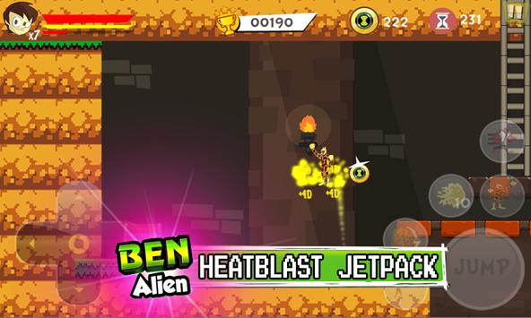 Super ben's 10 (ten) will jump and run up to speed up various obstacles. Fight and shoot with ninja flying fire, bat, reboot, ten, Heatblast, humungousaur, tennyson, skeleton, toy, kevin 11, shark, force omnitrix and omniverse many other monsters.