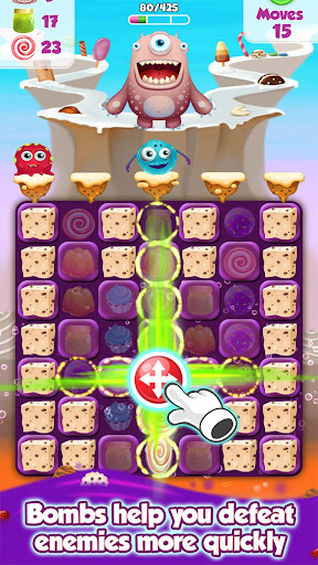 There are 5 different sweets on your match-3 playing board and each of them corresponds to a cute litle monster. As you progress through the game you will keep finding cards that help you unlock more and more best friends with even more amazing powers and boosters. The first two friends you meet are Octavia (the red lollipop monster) and Oxygen (the blue cupcake friend). Further along the game you will be able to unlock various friends for each of the five colors. Some of the rarest best friends also posses some of the best powers in the game.