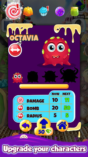 Upgrading the powers of your monsters is one of the main features of our "Best Friends in Candyland" match 3 game. Use your diamonds to purchase upgrades for your cute little buddies and increase the power of their damage as well as the radius of their bombs. As you go through the first few levels of the game you will encounter increasingly difficult opponents, so you want to keep your cute allies strong and prepared fo the challenges ahead.