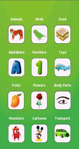 Food, Transport, Birds, Animals, People, Alphabets, Numbers, Fruits, Flowers, Vegetables, Toys, Shapes, Gems, Cartoons, Monuments, Monsters, Sea life, Body parts, Colors, Clothing, Time, Household, Instruments, Sports, Space, Superheros, Emotions, Zodiac, Insects, Flags