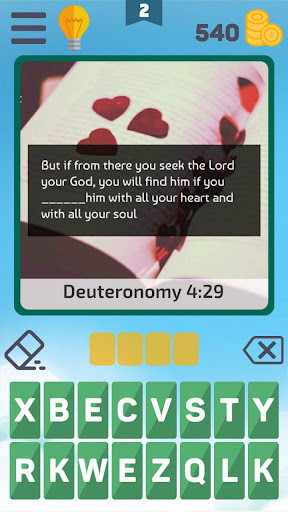 Bible Verse Quiz is a free offline android game through which everybody can improve their Biblical knowledge. An easy and fun way to exercise your brain and help you with your Bible Study.