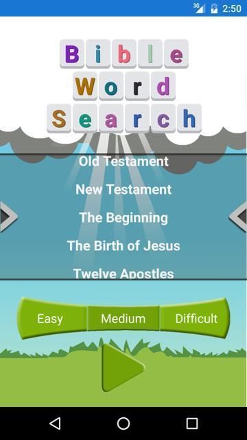 Bible Word Search made up of Bible inspired words which is a great game for Christians. Word Search is also known as word square, word grid, word finder and word locator goes back many years and could be found as a game in many puzzle books. Our Bible word search has 3 different difficulty settings which is perfect for children, kids, teens and adults basically a game for the whole family.