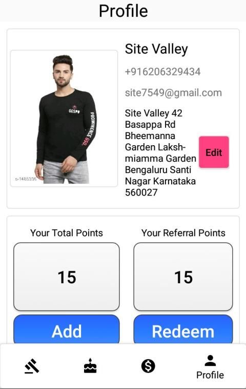 *Profile menu. Where the user can see his personal information and points balance. User can also refer and redeem his referral points.