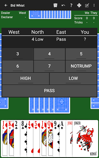 • Joker play during notrump contracts. Choose how jokers must be played during notrump contracts: can be discarded anytime one does not have the suit lead; must be discarded as soon as one does not have the suit lead; may be played anytime but will not capture the trick; or must be placed in the kitty or exchanged with the kitty.