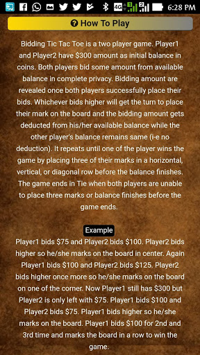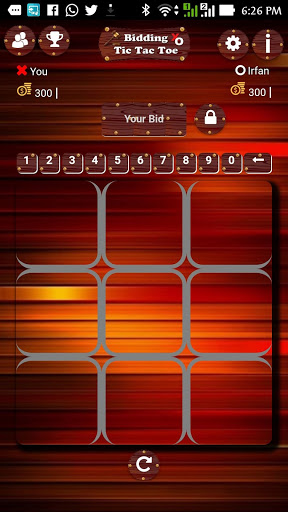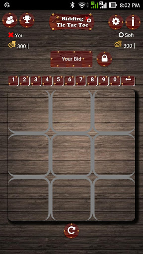 Bidding Tic Tac Toe is a free classic puzzle game for two players (an intelligent bot in absence of Player 2) placing bids and marking the 3 x 3 grid based board. The player who succeeded in placing three marks in a horizontal, vertical, or diagonal row wins the game.