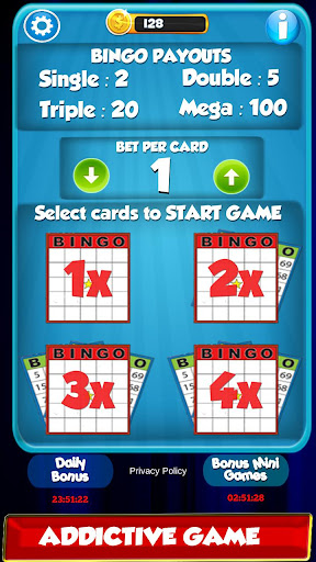 Use bet button to change the bet , select number of cards to play and start the game.Find and mark on your bingo card the drawing numbers which are showed and get 5 adjacent numbers in any direction to form a line and to win BINGO. Try to win as much as you can to climb to the top place on leaderboard. Every Day daily bonus for more free coins and every 3 hours diferent Bonus mini games - horse race, dice, match 3 and much more.