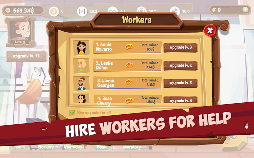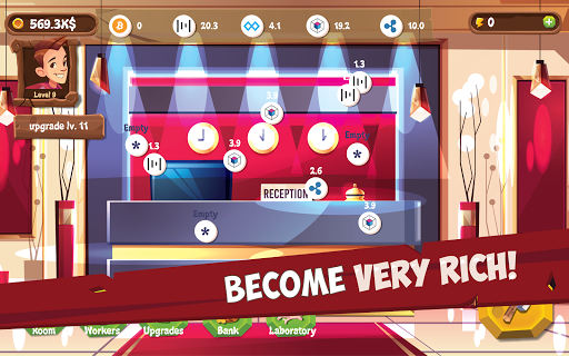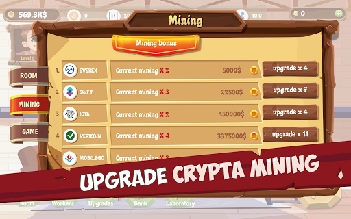Your house has nothing except a table and a wish to become rich. Start mining, get first crypt currency, upgrade your mining powers, invest in better equipment, hire workers and other different tasty upgrades which can make your mining strategy more profitable.