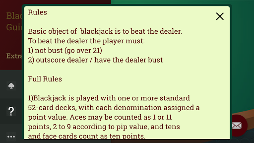 - Real Time guide : instead of using strategy charts and spreadsheets to find your next move, use the guide and choose easily your cards and dealer's card, and let it get you there! Fast and simple!