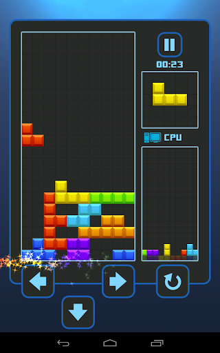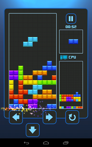 - Play with CPU: fighting with CPU. If you clear many lines at the same time, or clear lines consecutive, you will put some garbage line on the opponent's field. Try to defeat the smart CPU.