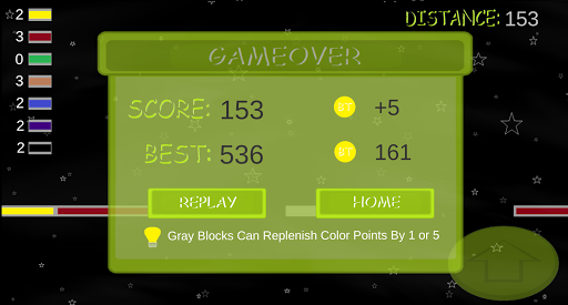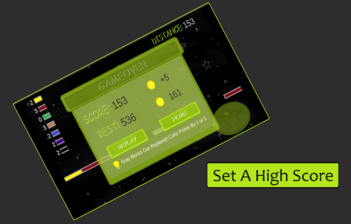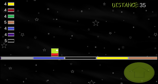 Travel through space jumping on colored blocks. Each color has hit points that can be lost or gained through out the journey.