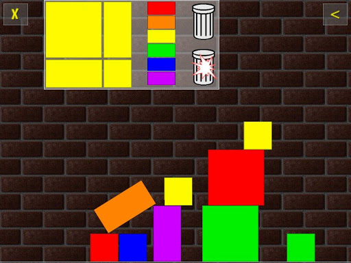 Actually this is not a game, it is more of a playable virtual toy. There is no winner, no loser, no objective and no points. It is intended for small kids. No reading skill is required. But even adults can find it engaging. The goal is to allow the user to freely express imagination and creativity. One can build anything using chosen blocks. Program simulates realistic physical environment with gravity and mass, so it teaches some basic mechanics on intuitive level and it also aids in development of hand-eye coordination. If there is not enough or too many blocks one can open a menu (right upper button) and add some more or remove some not needed. To add a new block (there is upper limit on that) simply drag a new block from menu and put it somewhere. To remove a block drag it into upper trashcan. To clear all blocks click bottom trashcan (the one with an explosion mark). To change color (before picking a block) click one of the colors in menu. Blocks For Kids is intentionally made simple, so there are only few block types and colors to choose from. For more fun there are three modes of gravity: normal, strong and low.