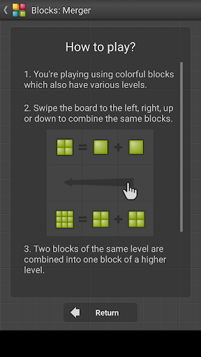 - Swipe the board to the left, right, up or down to move all the blocks and combine those with the same color and level.