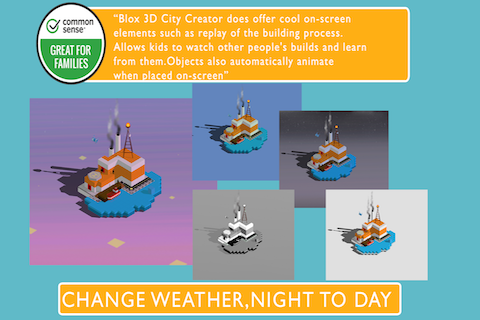 Blox 3D City lets you create fully functional cities and towns with simple taps, from busy metros to sleepy towns and rain-swept docks.Downloaded more than 2.5 million times and with 750,000 unique cities being built and shared by kids, its one of the world's bestselling city creators.