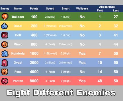 There are eight different enemies in the underground labyrinth, each one a little different from the others. They move at a variety of speeds, with the fast monsters capable of overtaking bomber man at full speed. They have varying degrees of intelligence. Some wander aimlessly about the stage, while others hone in on you and stay on your trail when you try to get away. And three of the monsters are capable of passing through the walls effortlessly. They are much harder to destroy, but if you happen to blow up a wall that they are inside of, they will be killed in the process.