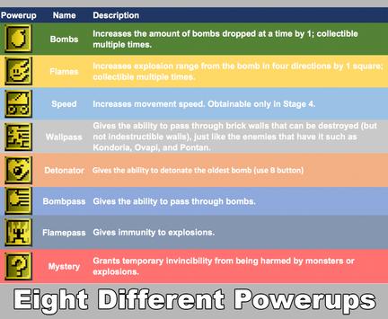 There are eight different powerups. Some are more rare or valuable than others, but it's a good idea to make sure you find the particular power-up hidden in every stage. To miss out on one is to put yourself, and bomber man, at a disadvantage. Dying from an explosion or touching an enemy results in losing all the powerups.