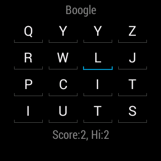 Boogle - Word Puzzle for Android Watch Touch adjacent characters in 8 directions, And make a word with up to 6 characters. Touch bottom to check words. Shake watch will reset the board.