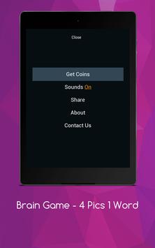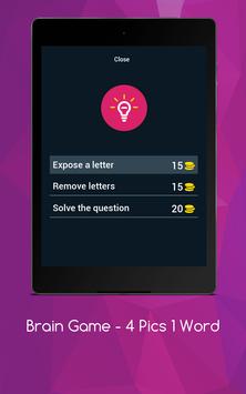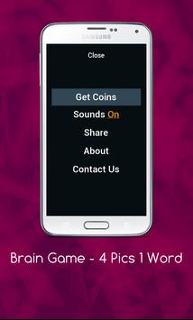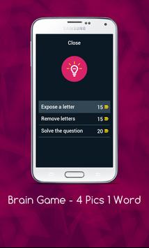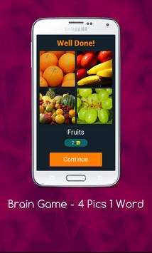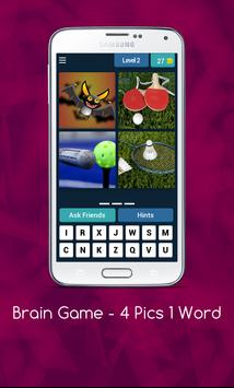 uses the 4 pics 1-word style. It is the ultimate brain game that lets you guess a word that has linkages and relations among 4 pictures provided. The puzzle brain game is suitable for adults, teenagers, youths and children alike. It can help to train the brain's memorization and recognition skills, making it active. It is a very educational brain game and also a great way to pass time when bored too :)