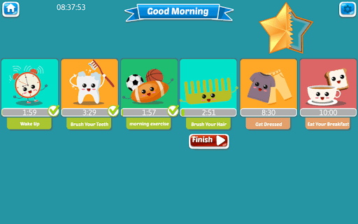 • getting ready in the morning with timer and happy songs for every action- brushing teeth, get dressed, morning exercise.