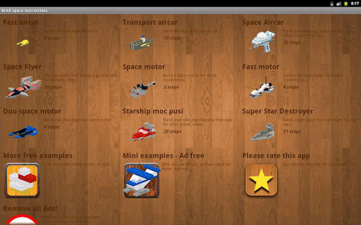 Get ready to fly in space! When the alarm sounds, it’s time for action! These space examples have everything you'll need, from space motors to star wars fighters. Unload the goods with these transporters and air cars. A brave star trek team is ready to launch the space flyers into the stars. The vehicles are divided into sub-models for easy building and instant play! Create those elegot figures and get the real and legot figures.
