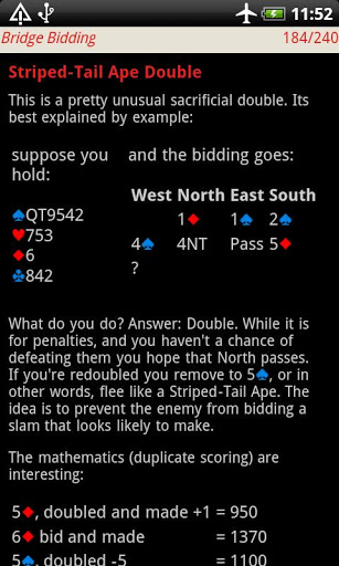 Over 200 Bridge Bidding ConventionsBridge Bidding is a searchable crossreferenced compendium of bridge bidding conventions.The application lets you swipe through over 200. Clicking on the search or Menu buttons allows you to search for a particular convention. If a search results in multiple matches then you can swipe through the results, or refine your search further.The application is very easy to use reference, and can be used when you have no phone signal or internet connection.