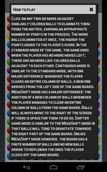 MegaShift is another one of the game styles available for Jawbreaker. The major difference in this mode is the addition of a new column of balls whenever the player manages to clear an entire column of balls from the game board. Balls will always move to the right of the screen if there is space for them to do so. As with the other modes, the game ends when the player ceases to have any moves left.