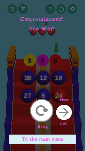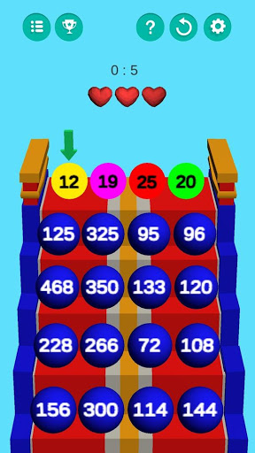 This is a simple game in which you need to find multiple numbers, that is, numbers divisible entirely by the current divider indicated on the ball, which is marked with a green arrow.To pass the level, you need to find all suitable dividends for each of the dividers in turn. Then you can go to the next level through the menu.This game can help train your memory and will be especially usefulfor children starting to learn division at school.