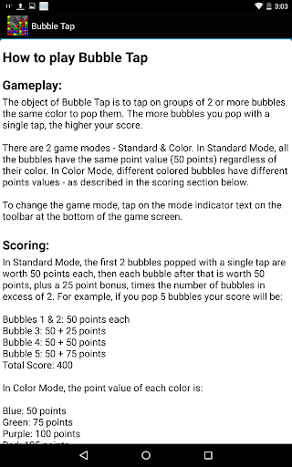 Bubble Tap is a bubble popper / bubble breaker game where tapping on groups of 2 or more adjacent bubbles of the same color causes them to pop. The bigger the group you pop, the more you score!