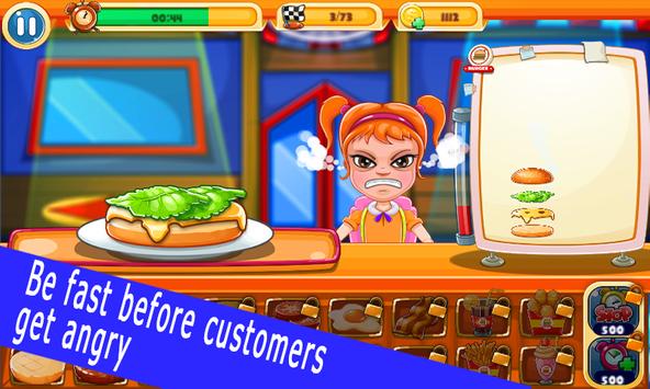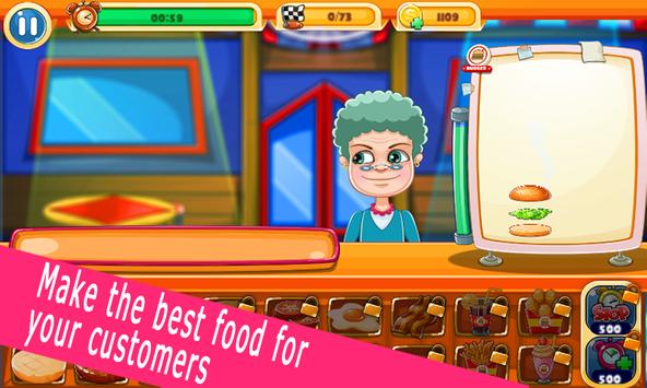 In this fast food game! You will run a small shop in the start. You will get to serve the customers by taking their order, with the money earned everyday and your cooking skills become famous, you can move to a bigger shop and make more variations of food like burgers, salads, pizza and drinks like coffe milkshake, ice cream and more just to make customers more happy with your food.