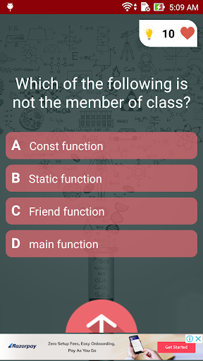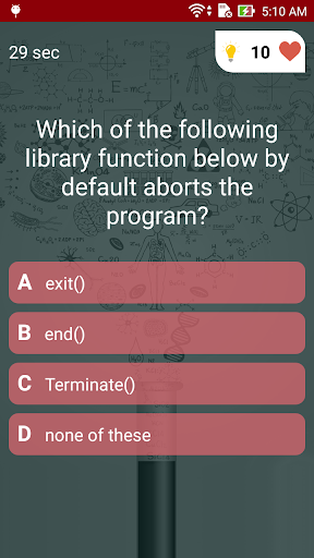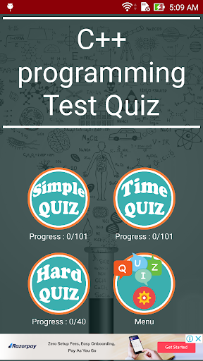 Using this C Programming Test Quiz game learn, spend some free time with it, have fun playing it. It has 3 types which is simple quiz, time quiz and hard quiz.