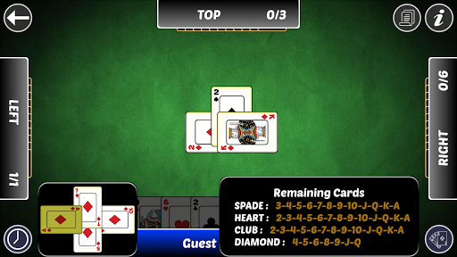 There are four players with no partnership. A standard international 52-card pack is used, the cards in each suit ranking from high to low: A-K-Q-J-10-9-8-7-6-5-4-3-2. The game is normally played counter-clockwise. The first dealer is chosen randomly. After each round, deal passes to the right player. Cards are dealt one at a time so that everyone has 13 cards.“