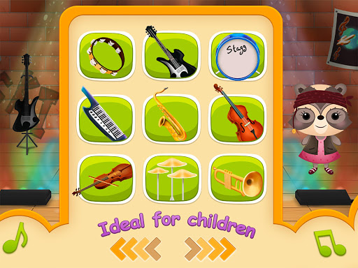 Discover the names of musical instruments. Candy the Raccoon will be delighted to play any of the many instruments in his personal collection for your child. Even toddlers will be able to hear the sounds of a tambourine, saxophone, electric guitar, drums, trumpet, violin, cymbals and synthesizer after simply selecting a relevant image.