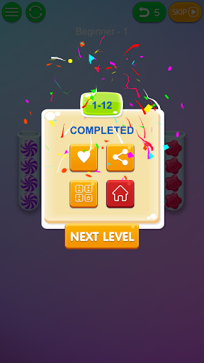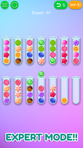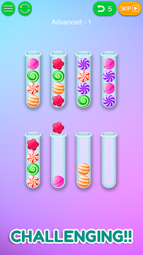 Sort the candy is a fun and addictive puzzle game! Try to sort the colored candies in the tubes until all candies have same colors in the same tube. A challenging and relaxing game to exercise your brain!