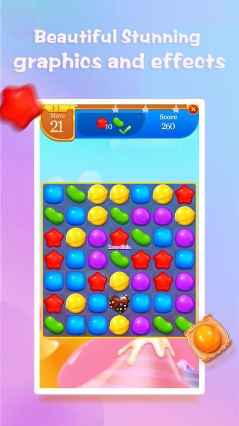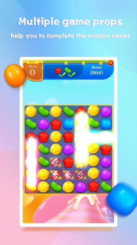 "Fun game with colorful candy, just click on the same color candy next to each other and it will blast.