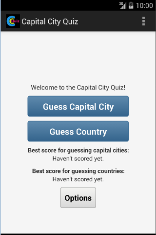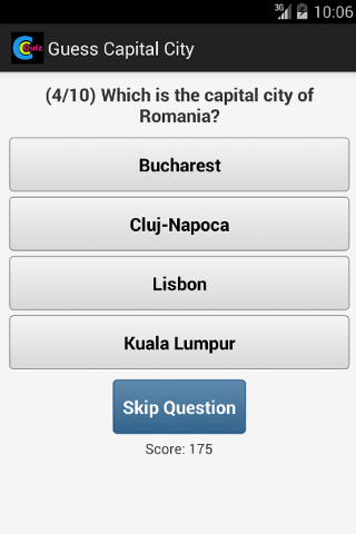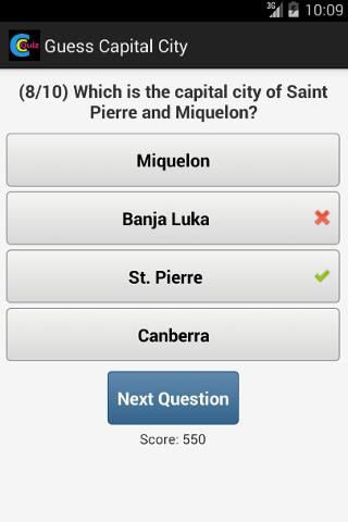 Capital City Quiz is a multiple choice geography quiz app / game, where you can guess the capital city of the given country, or guess the country of the given capital city. Cities and countries will appear on random, so your multiple choices will never be the same.