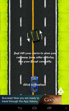 The aim of the player is to tilt his device to steer away from the incoming vehicles. The game also includes checkpoints which the player can catch for extra points and a handy boost function for those players that are hard to trill.