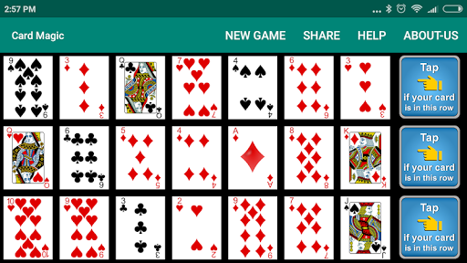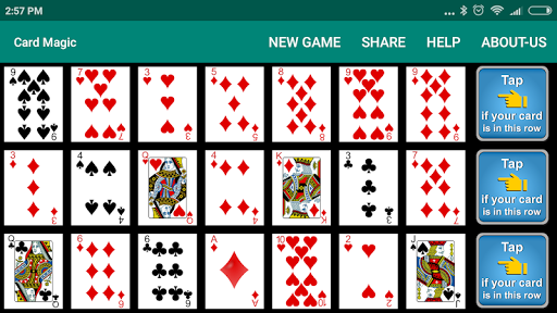 You will be shown 21 cards divided in 3 rows. Choose any one card in your mind (do not touch any card) and tap on the row it is in (there is separate button for that).