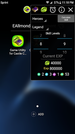 This is a very basic tool for castle clash. It allows you to calculate some information about evolving for books and upgrading hero/pet skills. You can also set alarms to make it on time to all your castle clash main events. The app runs in an overlaid window so you can run calculations, etc. and castle clash at the same time.
