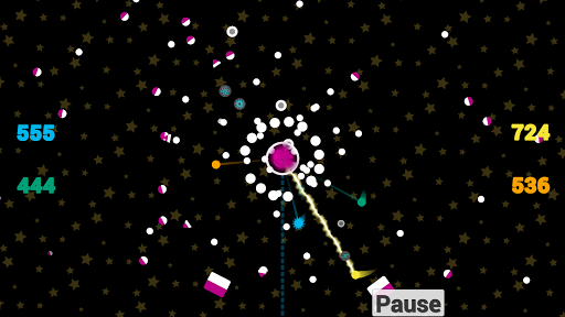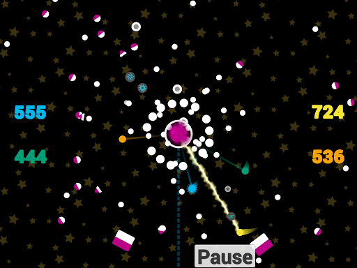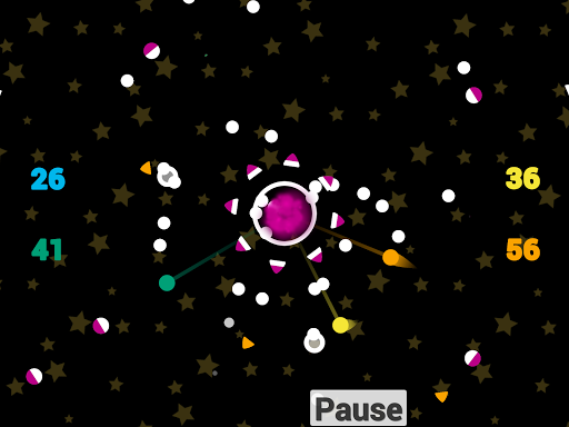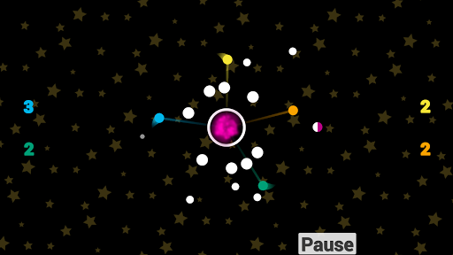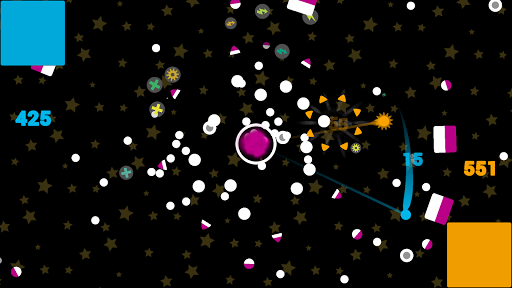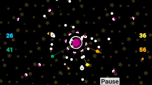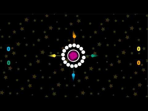 Circle around the center by hitting white objects and activating power-ups. Jump on other players for bonus score. Avoid purple surfaces and projectiles from other players.