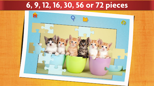 In this offline game with cute cats and kittens you can also choose whether to use 6, 9, 12, 16, 30, 56 or 72 pieces to adjust the difficulty depending on age and skill.
