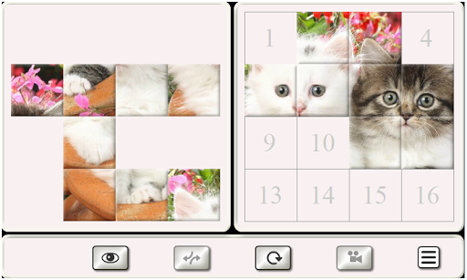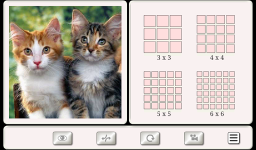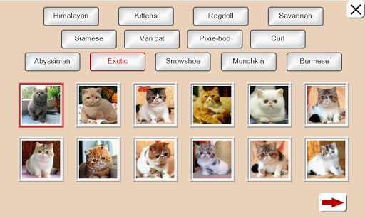 The game ”Puzzles” presents 13 themes – "Himalayan", "Kittens", "Ragdoll", "Savannah", "Siamese", "Van cat", "Pixie-bob", "Curl", "Abyssinian", "Exotic", "Snowshoe", "Munchkin", "Burmese".
