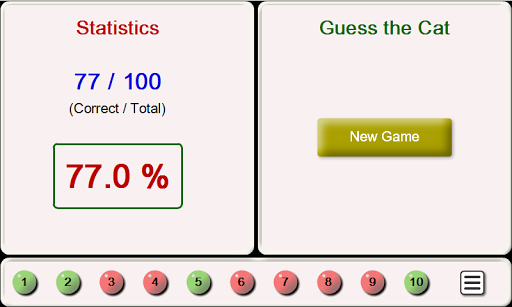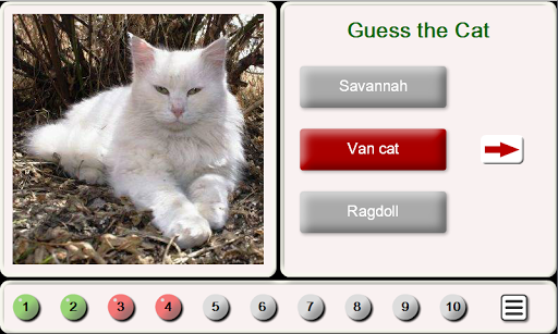 The game "Guess the Breed of Cats" is a fun quiz. Of the 3 proposed options, you need to choose the breed of the cat shown in the picture. The correct answers are indicated in green, and the wrong-in red, for each correct answer get 1 point. After you guess 10 photos, you will be able to see statistics –the number of correct answers and the number of all photos, as well as the percentage of correct answers from the total number of photos of cats.