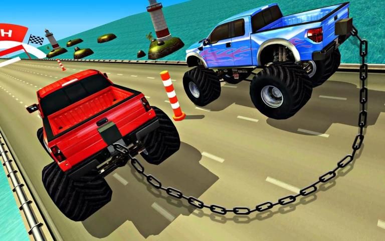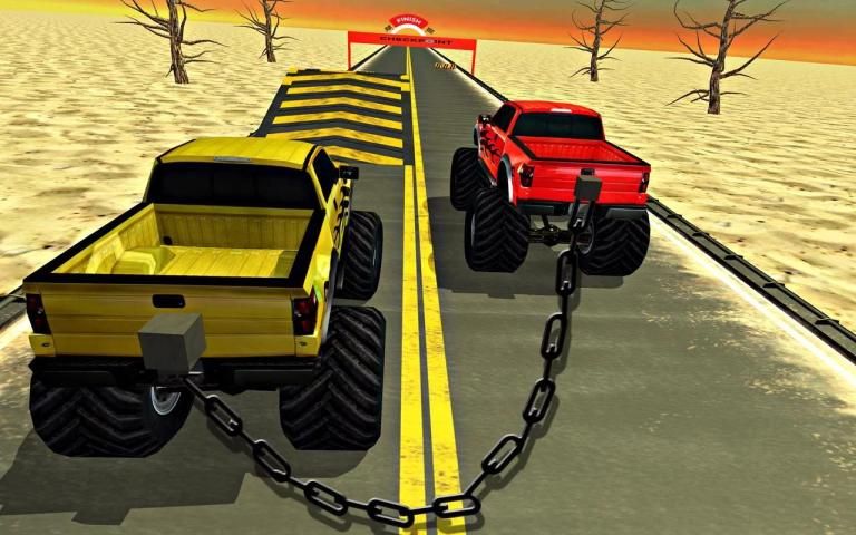 Race your fast sports 4x4 monster truck in a unique crazy race of chained car challenges, drive big fast monster truck which is huge on a rush track which is full of hurdles in car racing game. Pressing race pedal is not the only choice to win this competitive race of keeping the chained car and trucks connected to chain and getting them blown. It is a chained game where chain is everything and you need to keep the chain connected to the vehicles which are on road track, chain break makes