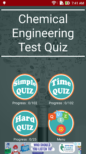 Using this Chemical Engineering Test Quiz game learn, spend some free time with it, have fun playing it. It has 3 types which is simple quiz, time quiz and hard quiz.