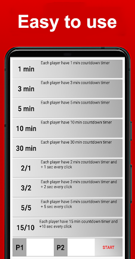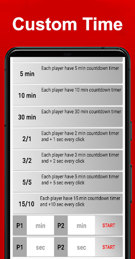 Chess clock comes with the following modes: 1m , 3m , 5m , 10m , 30m , 2m 1s , 3m 2s , 5m 5s , 15m 10s .