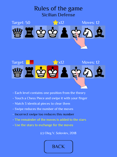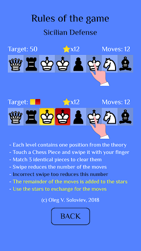 In Chess, there are many options for starting and answering. The Sicilian defense is one of them, but not the last, but, on the contrary, one of the most popular and successful. So, the goal of the presented game is to open and study all variants of the Sicilian defense in chess in a game form. The game develops concentration and attention, so necessary in chess. This game can be useful not only for chess players, experienced or beginners, but also for people who are just beginning to get acquainted with the ancient art of chess. And also to those who are quite far away from chess (smile).