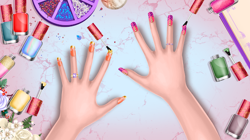 Enter the makeup salon with our bride and apply eyeliner, lipstick, mascara and other products. Match her makeup with her nails. Create a lovely manicure using pastel colors and sparkly decorations.
