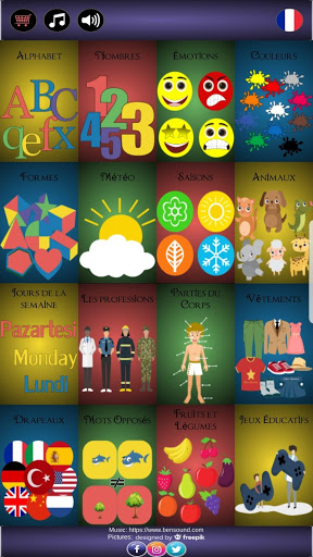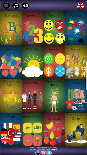 In this education, there are alphabet, flags, emotions, days of the week, weather, animals, clothes, professions, seasons, fruits and vegetables, antonyms, colors, numbers, shapes, parts of our body and 9 fun and improving games that support them.