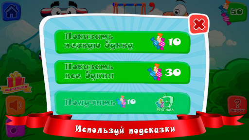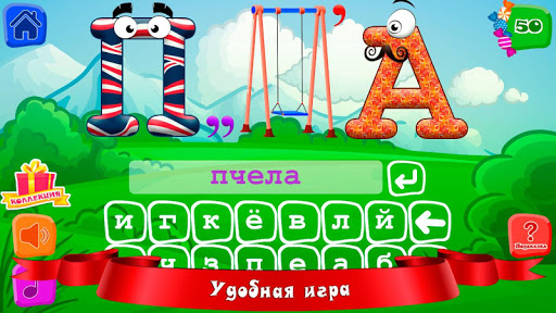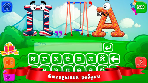 In the game "Children's puzzles" has 4 sections: animals, fruits and vegetables, plants, toys. If the kids find it difficult to guess the puzzle, it will always help tip in the form of a question mark at the bottom of the screen. By clicking on the question mark, the letter, which consist in the hidden word is highlighted. A word of praise that accompany the child throughout the game, the desire to solve puzzles give more and more. Rebus will be interesting to children from 7 years.